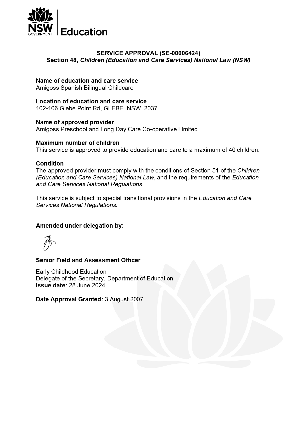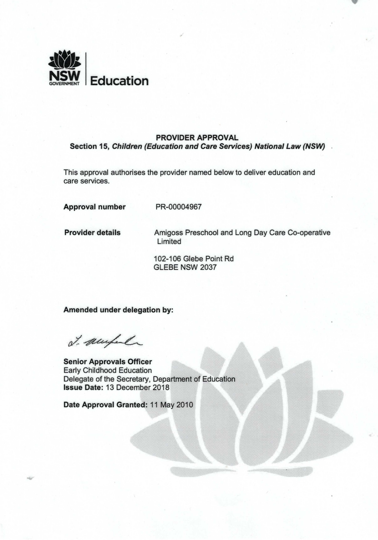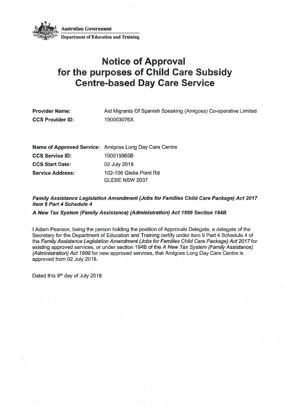 Notice of Approval for the purposes of Child Care Subsidy Centre - based Day Care Service