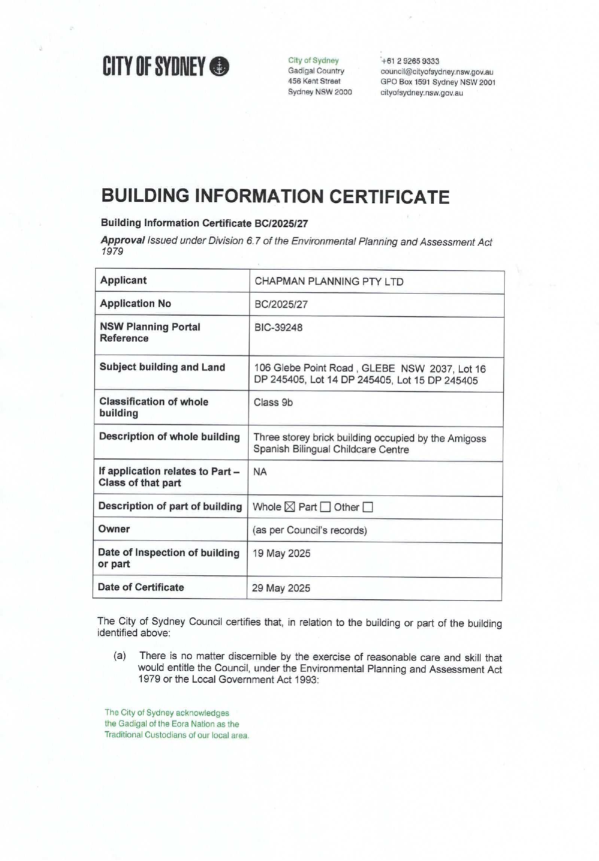 Building Information Certificate