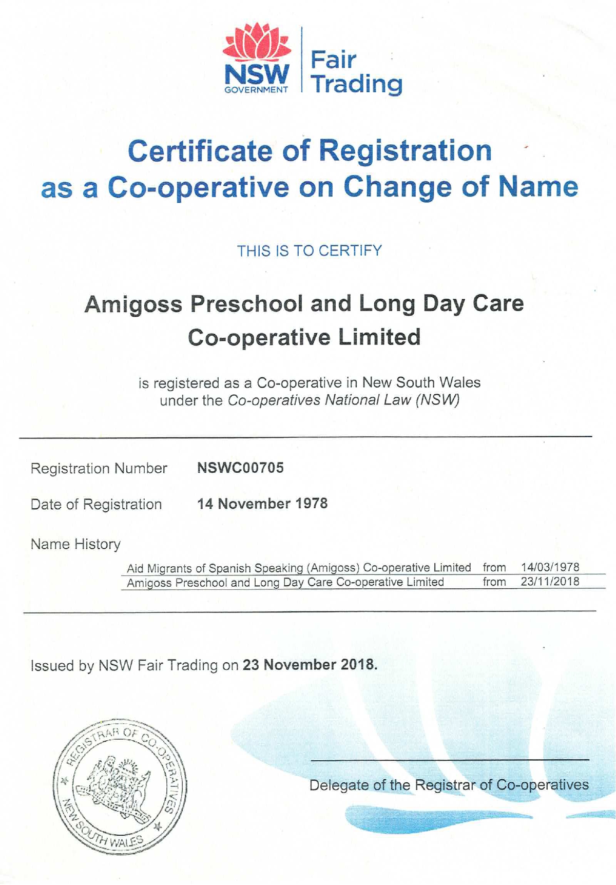 Certificate of Registration as a Co-operative on Change of Name
